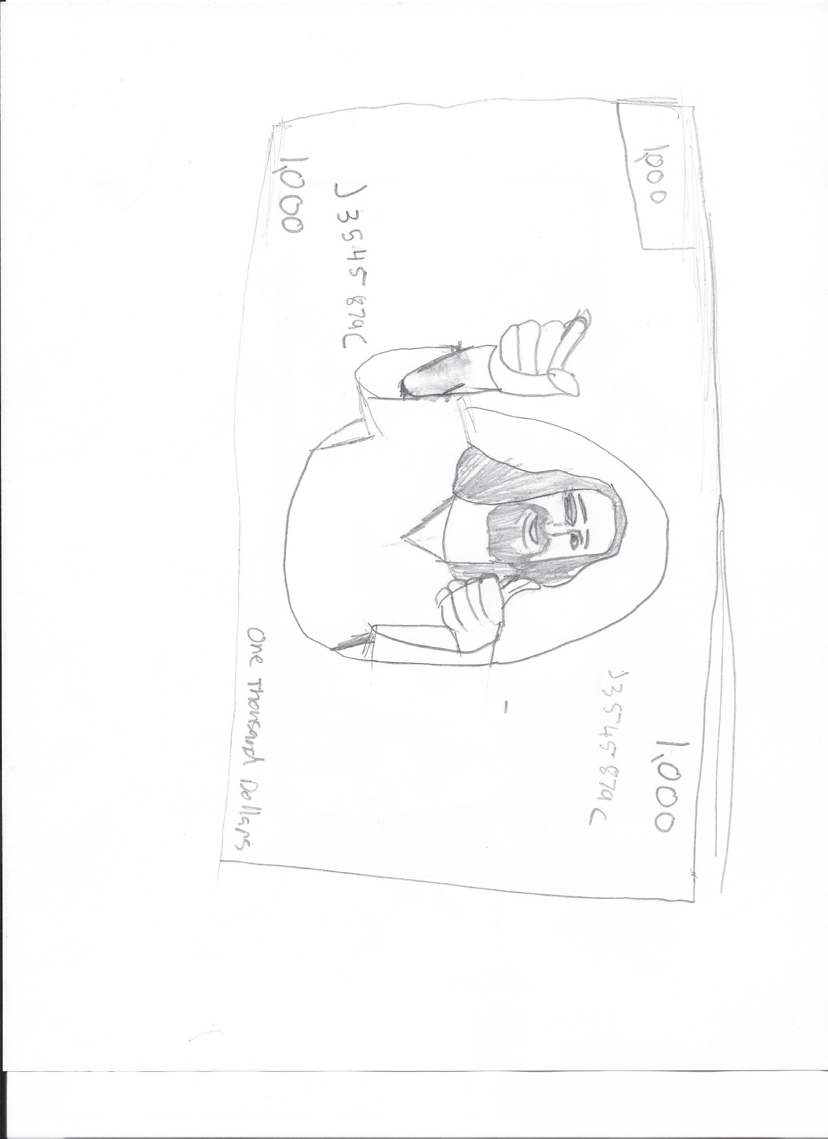 Here is a thing i have to do for art. The prompt is : "draw a picture of someone on a dollar bill, beside the presidents". I thought this would be funny. It isn't finished yet. Check it out.