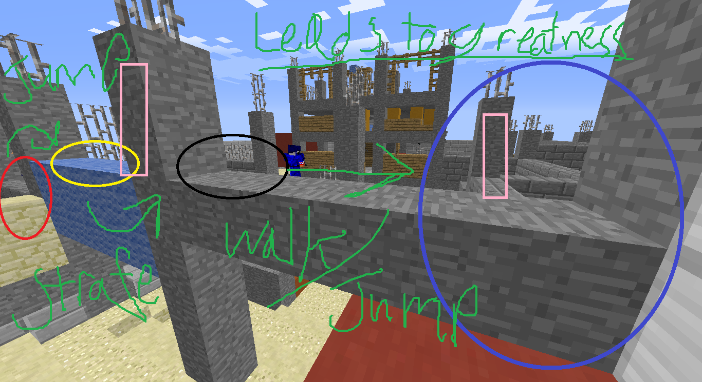 Get To = Walk from blue spawn halfway middle area / sandstone blocks on the left.