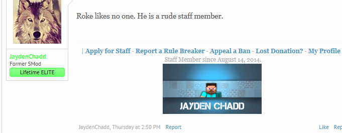 @Lord_Roke, don't mean to call you out, but you need to treat your fellow staff members with respect. What happened to you? You used to be so nice, just because you have personal problems (if you do, I'm pretty sure you do) doesn't mean you to have to blame the staff, @JaydenChadd resigned because of you, he was a great staff member. #RIPJayden